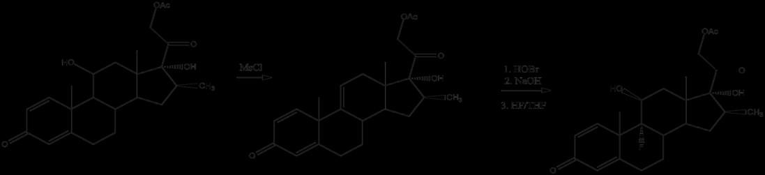 To synthesize Oradexon, 16β-methylprednisolone acetate is dehydrated to the nine,11-dehydro spinoff. this is often then reacted with a supply of hypobromite, like basic N-bromosuccinimide, to create to create spinoff, that is then ring-closed to associate degree epoxide. A ring-opening reaction with fluoride in tetrahydrofuran provides Oradexon.