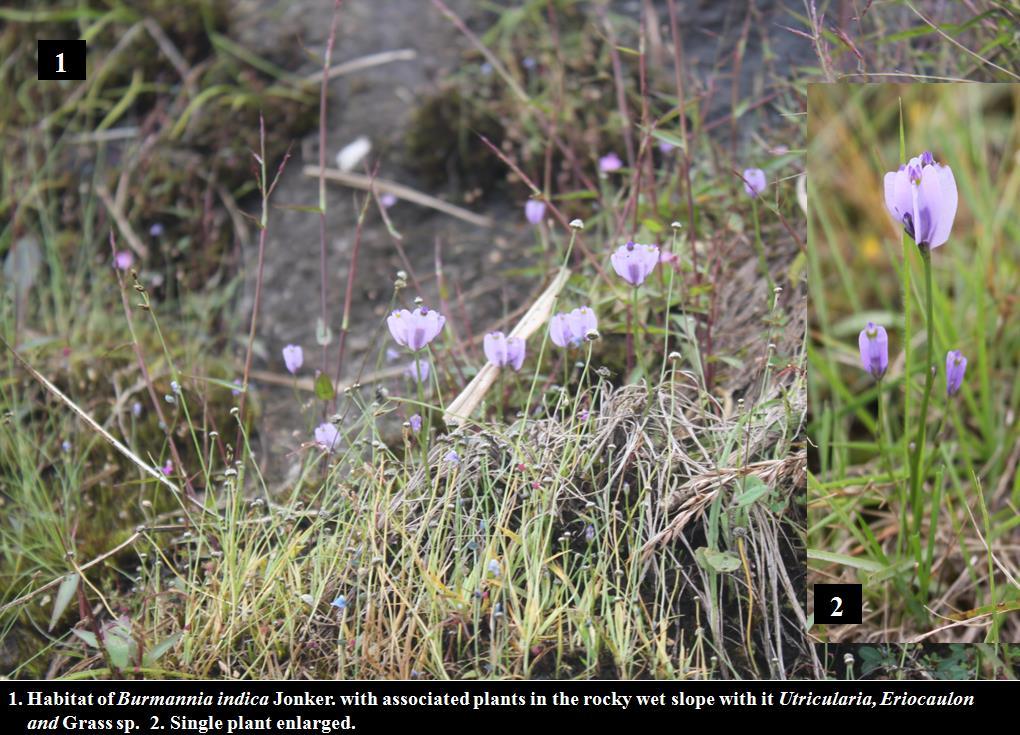 The genus Burmannia L. comprises about 59 species in world. In India, it records 4 species from Western Ghats of India, among them Burmannia indica being critically endemic to India. Jonker [5] was first described Burmannia indica, homogenous collection of Meebold’s in 1909 from Peermade (Idukki, Kerala) in his monograph of Burmanniaceae. Hazra [6] in Fascicles of Flora of India and Sasidharan [7] mentioned the occurrence of species based on previous collection and as an endemic to Kerala. There was no subsequent collection of this species anywhere from south India after the original collection by Meebold in 1909 [8, 9, 10, 11, 12].