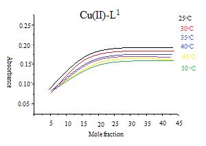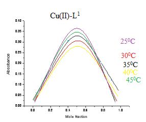 A aliquot of 60x10-4 to 0 M ligands L1 and L2 was pippetted into seven volumetric flasks of copper(II) sulphate pentahydrate standard solution 0 to 60x10-4 M. Over various temperature conditions such as 25, 30, 35, 40, 45, as well as 50 degrees Celsius, all measurements were taken at 535 nm . The curve peaks at a mole fraction of metal = 0.5, indicating the creation of a complex having an 1:1 M:L proportion[28-29] (Fig.3). Following is the equation for Job's system that was used in this study: