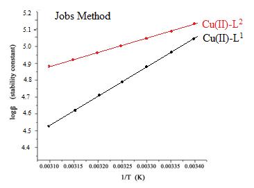 Fig.5: Plots of logβ versus 1/T for L1 and L2 with investigated Cu(II) complexes by Jobs Method.