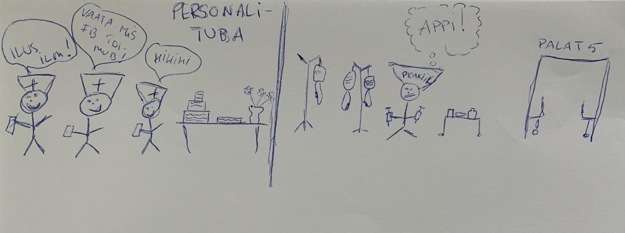 The students (praktik) were afraid of making mistakes or harming patients (during invasive procedures) and noted unclear learning goals and responsibilities, and excessive workloads as a silent shout for „help!‟ (appi!). The student drawings show nurses not always fulfilling their clinical or teaching responsibilities, dealing with trivial matters separating them behind the wall/closed door of the „staff room‟ (personali tuba). Therefore, the student and patients (palat5) were left alone. In addition, the data about teaching in the internships were characterized by barriers to learning, such as teacher incompetence, lack of social relatedness and risky autonomy; instead of being „present‟ for the „scariest‟ invasive procedures, the nurses do „other things behind their closed door‟. The students expressed having felt unnecessary and redundant in the practice institution, indicating a need for significantly more support and commitment from the clinical teachers.