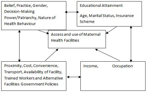 In order to clearly highlight the links between socio-economic and cultural variables and access and use of maternal health facilities, an integration of model of behavioural change in public health, rational choice theory and location theory is shown in fig. 1. It highlights and also activates factors affecting access and use of maternal health facilities.