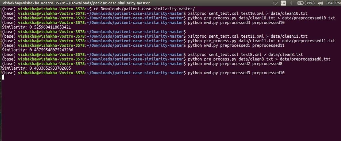 Initial command cleans the xml file in which the vectored data is present followed by the command that pre-processes the cleaned text file and wmd command compare the pre-processed text file with the one present in the database of hospital staff and yields out how identical patient’s file is with the files existing in database.