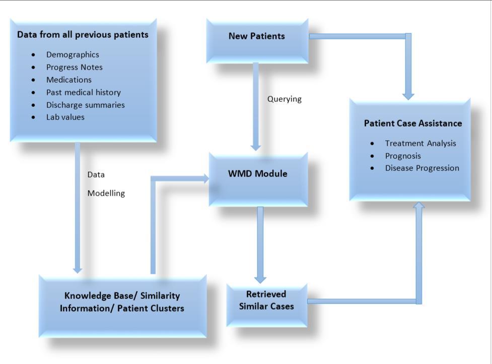 WMD stands for “WORDS MOVER’S DISTANCE’’. It defines that distances & between embedded word vectors are to some level systematically meaningful. It utilizes the above mentioned property of embedding & treats text document as a weighted point cloud. It overcomes basic distance measurement limitation. It is used to compare two pre-processed files where one file is of patients’condition and the other file is stored with the hospital’s staff.