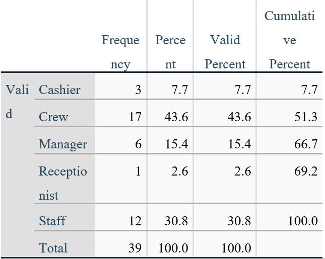 Based on the data gathered from the researchers, there are more crew working in a restaurant with a higher percentage of 43.6% than a receptionist with the lowest percentage of 2.6%.