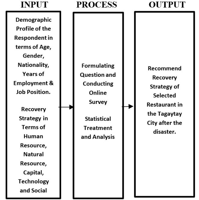 establishment and attracts more customers by ensuring their safety and satisfaction. The Process includes data gathering by using an online survey questionnaire as the research instrument. The data that will be gathered will be analyzed by the researchers by using statistical tools. Lastly, the Output of the study will determine and propose the foremost or the most effective restaurant strategy that is used by the selected restaurant in Tagaytay. Another output will be the suggestion/recommendation on how to further improve the strategist that has been used by the restaurant in Tagaytay.