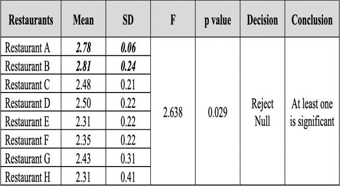 Table 3.5 shows that Resulting p value of 0.531 which exceeds the level of significance of 0.05 denotes that the mean recovery strategy in terms of social resources is not significantly different among different restaurants. Although not significant, it can still be described that Restaurant E and Restaurant H have the highest mean score of 3.45, while lowest is from Restaurant B with only 3.05 mean score. It demonstrates that social can be improved and has a significant impact on how quickly a restaurant can recover.