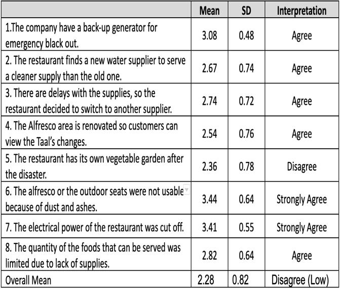 In terms of Natural Resource, resulting in an overall mean of 2.28 implying low levels of recovery in terms of natural resources. Specifically, the highest mean is 3.44 implying that they strongly agree that alfresco or outdoor seats were not usable because of dust and ashes. This is followed by a mean of 3.41 which denotes strong agreement that the electrical power of the restaurant was cut-off. On the other hand, the least mean 2.36 implies that they disagree that the restaurant has its own vegetable garden after the disaster. This is followed by a mean of 2.54 which denotes that they agree that the Alfresco area is renovated so customers can view the Taal’s changes.
