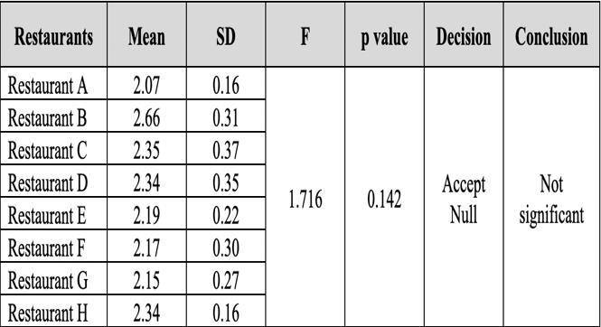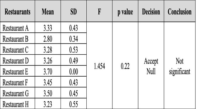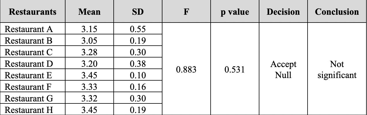 Table 3.1 shows that the resulting p value of 0.22 which exceeds the level of significance of 0.05 denotes that the mean recovery strategy in terms of human resources is not significantly different among different restaurants. Although not significant, it can still be described that Restaurant E has the highest mean score of 3.70, while lowest is from Restaurant B of 2.80.