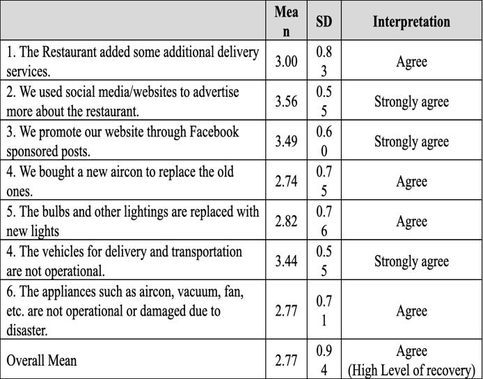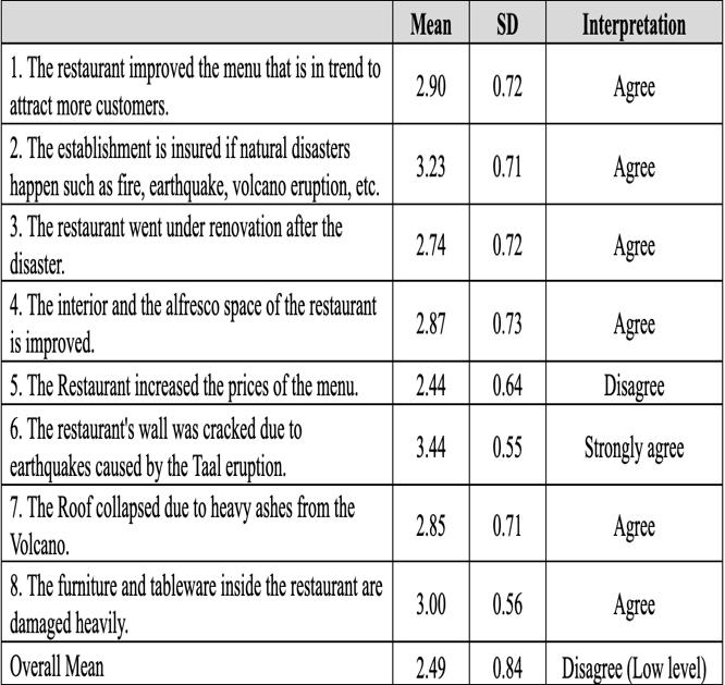 The table shows that the selected restaurants in Tagaytay City got a “Strongly Agree” interpretation on using media for promoting business, and not operational delivery transportation. “Agree” interpretation on additional delivery services, replacing old air conditioners with new ones, new bulbs, and not operational damaged appliances due to disaster. With this, the proponents perceive that there is a high level of recovery strategy in the selected restaurants in Tagaytay City.