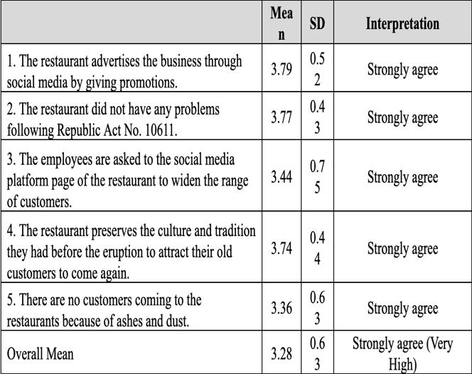 This table shows that the participants of the study in Tagaytay City got “Strongly Agree” interpretation for advertising the business through social media by giving promotions, the restaurants did not have any problems following Republic Act No. 10611, the employees were asked to share the social media platform page of the restaurant to widen the range of customers, restaurant preserves the culture and tradition they had before the eruption to attract their old customers to come again, and lastly, there are no customer coming to the restaurant because of ashes and dusts. With this, the proponents perceived that there is a very high level of recovery in terms of Social and political.