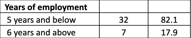 Based on the data gathered from the researchers, there are more employees employed five years and below than six years and above.