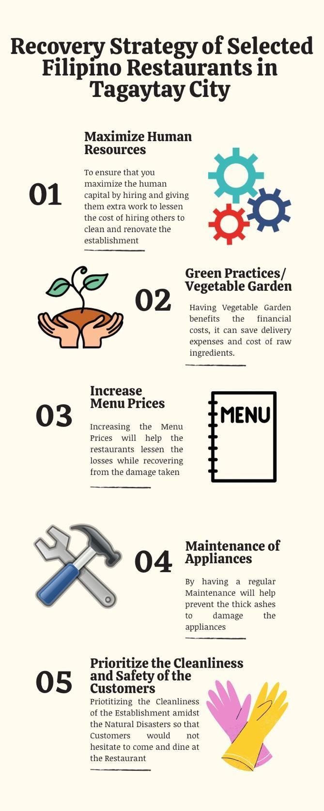 Mention here are the highest mean score from the data results gathered by the researchers and conclude the selected restaurants in Tagaytay City have no significant difference in terms of Human Resource, Natural resource, Technology, and Social and Political. Thus, the recommendation can be applied to everyone. For human resources, employees are trained properly especially in certain circumstances such as natural disasters. This will ensure that the staff have enough knowledge in handling natural disasters that can add to the safety of their customers. So that they can gain their trust and loyalty to the establishment and will feel secured during their entire stay. For the Natural resources, Al fresco or the outdoor seats were not usable because of dust and ashes. Due to it being outdoor dining, the tables and chairs were not usable and covered with ashes. This can also impact their sales for the day because the capacity of the establishment will not be able to accommodate the maximum numbers. For Capital Resources, the restaurant's wall was cracked due to earthquakes caused by the Taal eruption. This can also affect the guests coming to the establishment, we should ensure their safety and because of the cracks some restaurants will close to ensure that it will be fixed immediately because they are always after for the safety of the staff and customers. For Technology Resources, they used social media websites to advertise more about the restaurant. In promoting their restaurant, they used platforms such as Facebook and Instagram through sponsored posts that can help reach people easily. This can help generate more customers and respond to customers' queries and suggestions as soon as possible. For Social and Political factors, the restaurant advertises through social media by giving promotions. Following the restaurant’s laws and regulations while promoting the establishment. This will help generate income and increase the establishment's reputation and help customers discover different Filipino Cuisines and Culture.