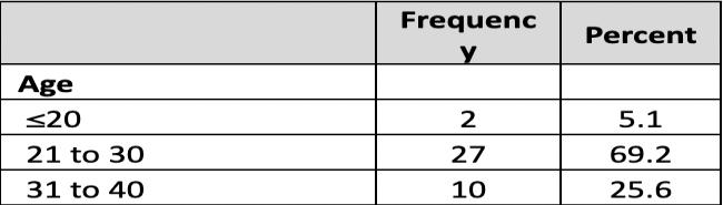 Table 1.1 shows the age of respondents in which 69.2% are ages 21-30 with a total of 27 for the frequency and 25.6% are ages 31-40 with a total of 10 frequency out of 39 and 5.1% are ages 20 and below with frequency of 2.