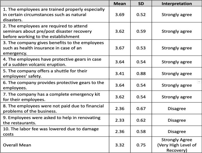 The selected restaurants in Tagaytay City have a very high level of recovery in terms of human resource by taking care of their staff, giving proper training, seminars, and benefits. Training employees lessens the losses by knowing what to do in certain circumstances. According to Majid Ahmed Al Qasimi (2021), training is a managerial, technological, realistic, and scientific approach that maximizes work efficiency, and improves the use of the available human capital of the company. For the lowest rank, the respondents disagree that they were asked to help in renovating the restaurant. Asking to work outside their duties and responsibilities will lessen the enthusiasm of the employees.