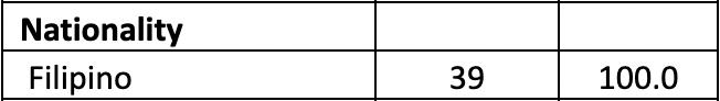 Based on the Data, 100% of the Managers and Staff are Filipinos basically because the restaurant itself is Filipino. There is no other nationality better than Filipinos in serving their own culture.
