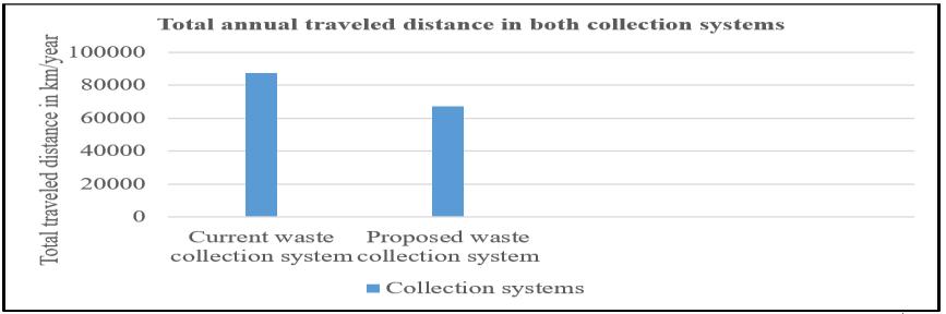 Total annual traveled distance in proposed waste collection system is 30% lesser than the total annual distance covered by waste collection vehicle in current waste collection system due to the optimization of the collection road. In addition, there is 30% save in terms of the total annual vehicle running cost.