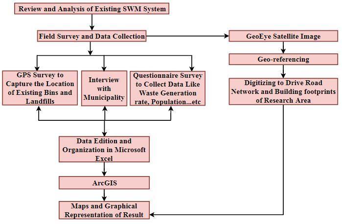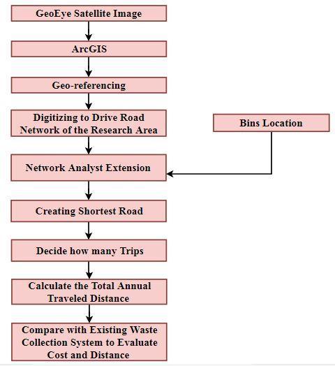 The purpose of the first objective of this research is to analyze and map out the current SWM situation in the research area and evaluate those problems which appear due to improper waste management. Based on the identification of the problem another model was proposed to improve the current situation of SWM system. This study was included argument and a critical analysis of the model. So, this analysis was helped to identify different waste management problems and the ways how GIS was used to deal with waste management in a different situation. Based on the analysis of the existing condition of the waste management, availability of the data in study area another model was proposed. In the proposed model the current problem such as the improper location of the bins, an unaccepted walking distance of the bins, lack of required bins, the frequency of removal of waste from bins to landfill and planning the shortest road for waste transportation was solved. The detailed methodology is shown in fig 1.