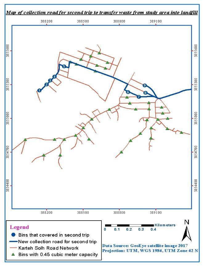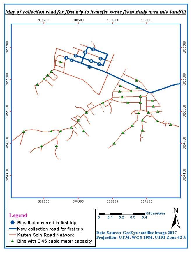 Table 4.6 explains that totally there is need of five trips to cover all the bins to collect waste and transfer it to landfill. These five trips can be done by two vehicles or five vehicle belongs to municipality schedule and their machinery. In every trip nine bins with a capacity of will be visited by a collection vehicle with a capacity of . Furthermore, the total traveled distance is different for each trip. The total traveled distance to cover all the bins for collection frequency of twice a week is 64.78 km.
