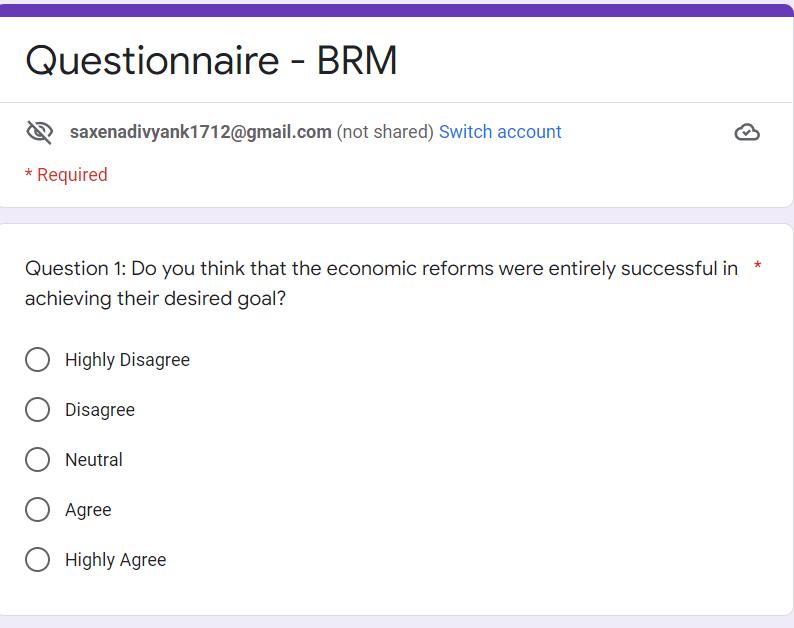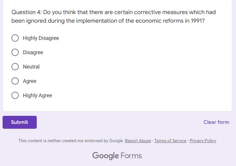 In this survey, there were close-ended questions, which were essentially designed to ask the opinion of the respondents on the economic reformsof1991.They had to select oneout of the 5availableoptions, i.e., Highly Disagree, Disagree,Neutral, Agree and Highly Disagree.