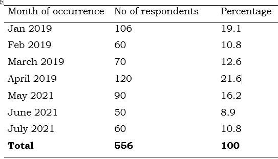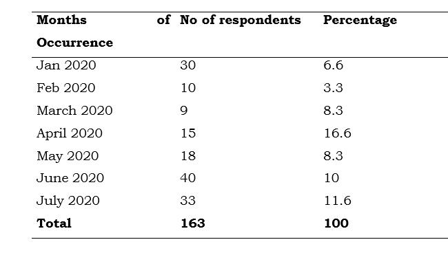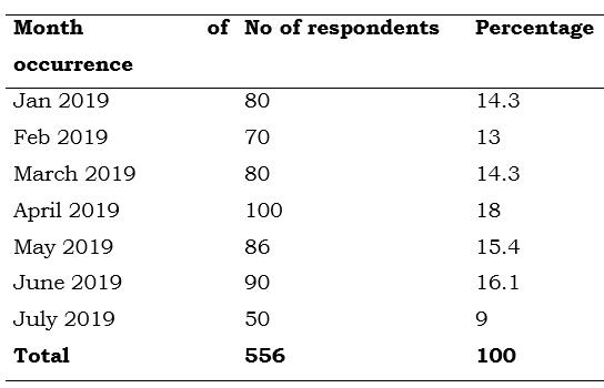 The results as seen in Table 4.4.2 above indicated that 80 (14.3%) was for January, 70 (13%) February, 80 (14.3%) March, 100 (18%), May recorded 86 (15.4%), June recorded 90 (16.1%) while July recorded 50 (9%). This shows that patient turn-up before covid-19 was very high.