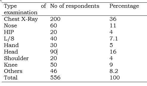 The result of the present study as seen in table 4.2 shows distribution of Type of Examination with Chest x-ray recording the highest number of examinations with 200 respondents representing 36%. While HIP examination recorded 20 with 4% which is the lowest. The finding indicated that more of chest x-ray examinations was carried out during the period of this research work.