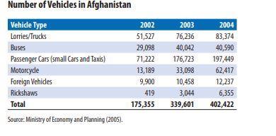 The primary factors contributing are persistent utilization outdated and poor maintenance vehicles; poor fuel quality; small-capacity roads in poor repair; and rapidly increasing vehicle numbers. In winter, the capital city Kabul is coated with a cover of dust and pollutants at nighttime and in the mornings due to a phenomenon known "atmospheric inversion" that collects pollutants around the region.Air pollution seems to be very high throughout spring and summer whenever the air is dry and dusty which lead to spike in asthma attacks(NEPA, 2008). based on the Ministry of Public Health (MoPH), the consequence of air pollution in the capital of Afghanistan air pollution in Kabul will lead to the death of more than 3,000 people per year. The MoPH epidemiological research also indicate that cardiovascular and respiratory diseases due to water pollution in Kabul increase the total death rate of the nation by four percent per year (irinnews, 2009). Based on the estimation of Afghanistan Government air pollution in Kabul case almost 3,000 deaths per year which is high as last year's number of civilians killed in Afghanistan during the ongoing war (Laura, 2012) In the following table PAH pollution from automobile emissions throughout the years of 2002 to 2004. Since 2004, the overall number of vehicles recorded in Afghanistan were 402,422, about 18% more than in 2003 and 129% than in 2002(ADB, 2006)