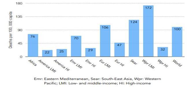 Fig1: Deaths per capita attributable to the joint effects of household air pollution and ambient air pollution by region, 2012 (C. Dora, WHO)