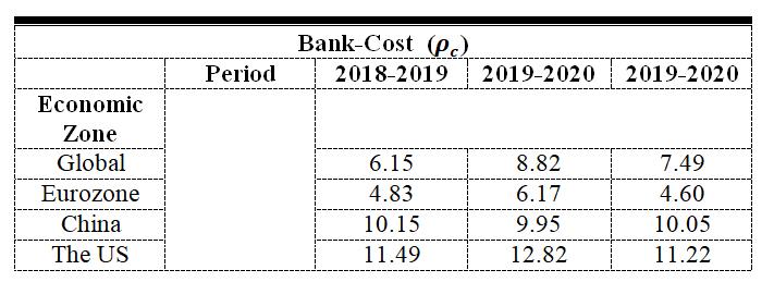 zone showed the largest critical transition drop from 6.17% c = (2019-2020) to 4.60% c = (2020-2021) equivalent to 23.18% drop, followed by the Global zone with a decline from 12.82% c = (2019-2020) to 11.22% c = (20202021) which was equivalent to 12.48% This economic improvement also occurred to China which experienced the lowest value of bank cost with 0.3052 eff = . On the other hand, the system was collapsing during the critical global crisis in a view that, all the economic zones were still experiencing the rise in bank cost eff except for the China (2020-2021) economic zone that managed to control the cost from eff = 0.3117 (2019-2020) to eff = 0.3052 (2020-2021)