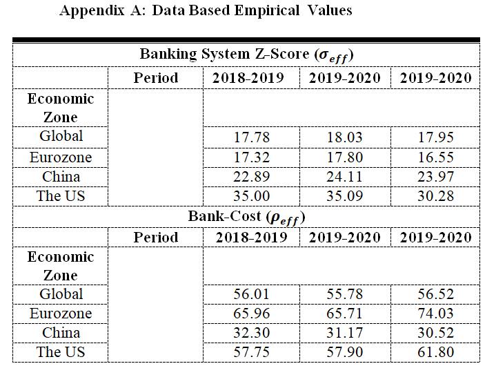 In this period, the results confirm that the US economic zone was the most resilient zone followed by the China zone. The Eurozone was the least resilient banking system in that, for the US zone to collapse completely, it needs to reach the bankcost of 11.49% c = while the Eurozone collapses completely (tipping point) at 4.83% c = . Additionally, all economic zones, including the global economy, experience the moderate values of banking system z-score as summarized in Table A1 (Appendix A) and data-based bank-costs which were not exceeding the thresholds, indicating the optimal banking system performance.