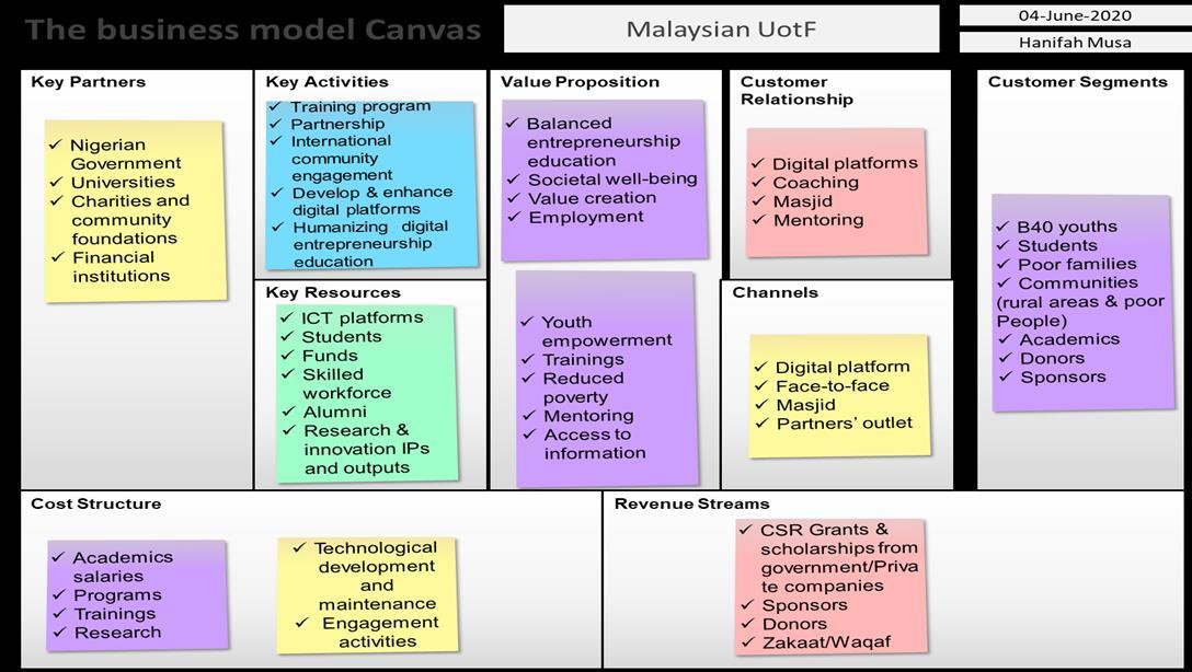 This paper proposes a conceptual Malaysian UotF business model – in the form of BMC (Business Model Canvas) and VPC (Value Proposition Design Canvas, that will help to highlight key value propositions and benefits of international community engagement, show what universities should pay attention to and transform present day universities into universities of the future by leveraging on digital capabilities and platforms, and are relevant in the digital era through humanizing entrepreneurship education. The BMC is a new business paradigm which consists of nine building blocks [6] These nine building blocks of the BMC are namely: customer value proposition, customer segment, customer relationships, key activities, key partners, channels, revenue streams, key resources and cost structures.