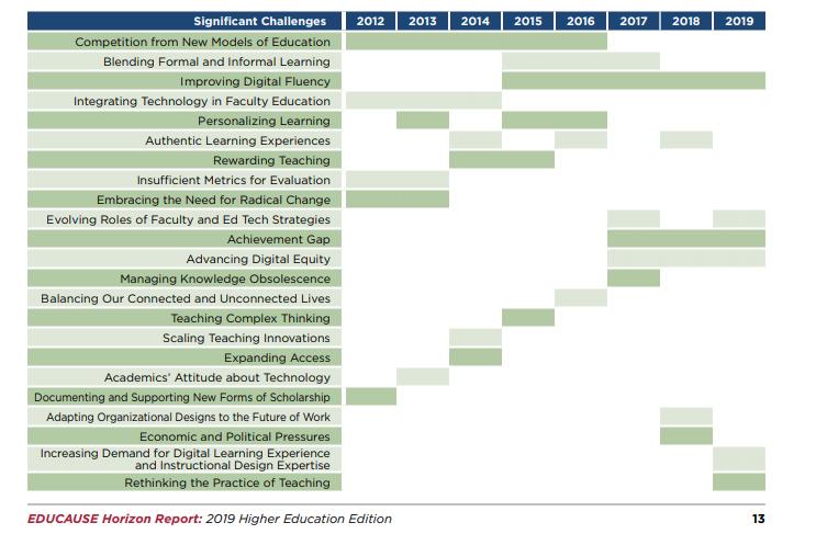 The technology development picked by the 2019 Horizon Expert Panel have the prospective to expand access and convenience, improve the teaching profession, leverage data, foster authentic learning, spread digital fluency, and stimulate further innovation. Important developments in educational technology for higher education between the years 2012 and 2019 are identified below: