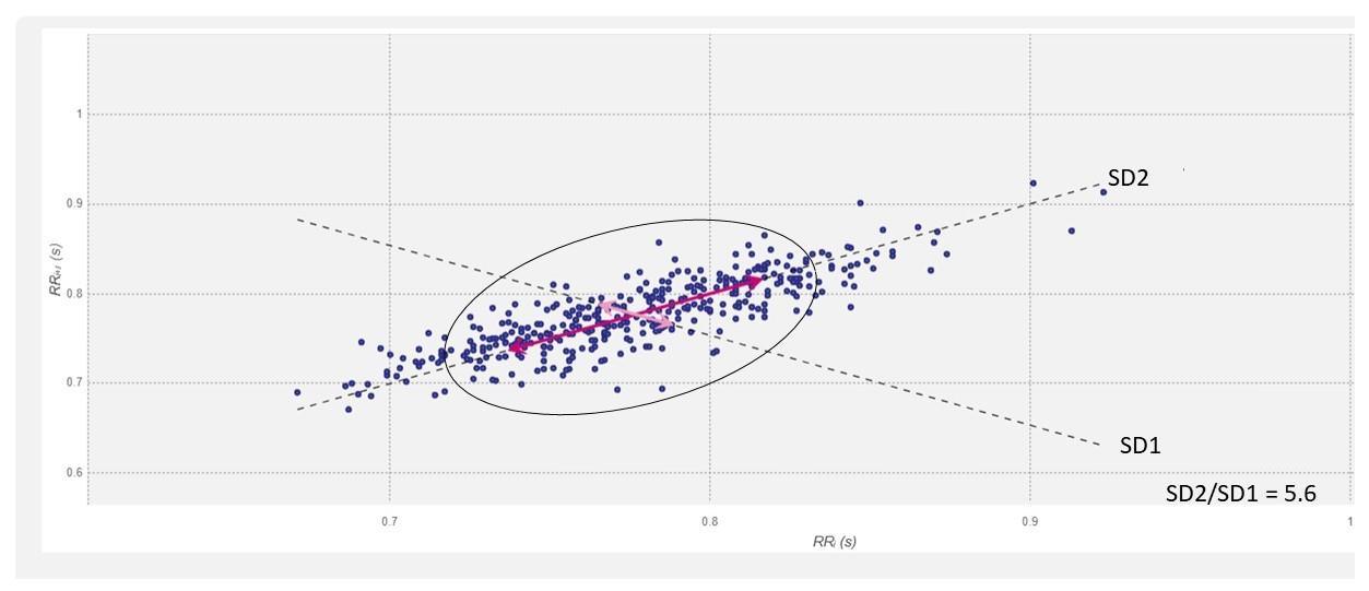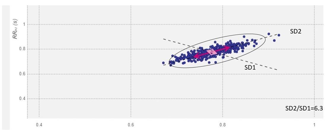The plots in this figure are the Poincaré plots by fitting an ellipse to the scatter plotted points. The Poincaré plots help in the visual identification of the presence of non-linear HRV components. The non-linear measurements such as SD1, SD2, and S can be derived after fitting the ellipse. The standard deviation (SD) of the distance of each point from the y axis = x-axis denotes the width of the ellipse called SD1. SD1 is measured in milliseconds and correlates with the baroreflex sensitivity (28) not only in the arteries but also on the sinoatrial node or SAN (the pacemaker of the heart) (31). On the other hand, SD2 of each point from the y = x + average of the R-R interval denotes the length of the ellipse (28). SD1 denotes parasympathetic activity (increases the beat-to-beat or R-R interval), while SD2 denotes the sympathetic drive (decreases the beat-to-beat time or R-R interval). The ratio of SD2/SD1 predicts the R-R time series which in turn denotes the sympathovagal balance and correlates with low and high-frequency (LF and HF), respectively, and its ratios (HF/LF) (28) A high SD2/SD1 ratio indicates sympathetic overdrive or parasympathetic dampening or dampening of both with relatively more dampening of the parasympathetic drive. It correlates with LF/HF and has a potential influencing effect on the SAN and the electrical conducting systems of the heart. The normal SD2/SD1 value must be below 2.5 (32)