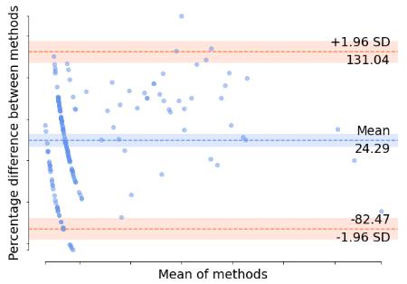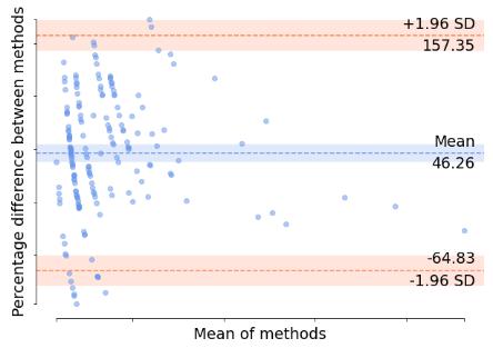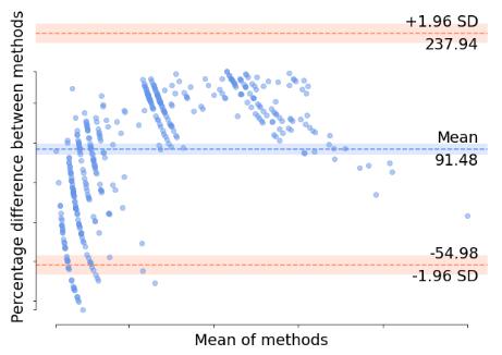 Fig. 3 shows the pair-wise BARA plots. In each plot, the red lines are the upper and lower bound SDs and the blue line in the middle is the mean. It is expected that the percentage difference of the methods must be around the mean to predict good inter-rater reliability. Here, the plots show high inter-rater reliabilities or less proportional bias as most of the data points lie close to the mean of methods.