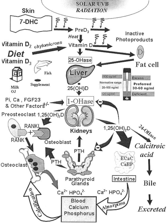 FIGURE 2. Schematic representation of the synthesis and metabolism ofvitaminD for regulating calcium, phosphorus, and bone metabolism. Duringexposure to sunlight, 7-dehydrocholesterol (7-DHC) in the skin is convertedto previtamin D3 (preD3) and then bya heat-dependent process to vitamin D3 Vitamin D (D represents D2 or D3) made in the skin or ingested in the diet isconverted by the vitamin D-25-hydroxylase (25-OHase) to 25- hydroxyvitamin D [25(OH)D]. 25(OH)D is converted in the kidneys by the25-hydroxyvitamin D-1α-hydroxylase (1-OHase) to its biologically active form 1,25dihydroxyvitamin D [1,25(OH)2D]. 1,25(OH)2D increases the expression of the 25-hydroxyvitamin D-24-hydroxylase (24OHase) to ca-tabolize 1,25(OH)2D and 25(OH)D to the water-soluble biologically inactivecalcitroic acid. 1,25(OH)2D enhances intestinal calcium absorption in the small intestine. 1,25(OH)2D is recognized by its receptor in osteoblasts, causing an increase in the expression of receptor activator of NFnB ligand (RANKL). CaBP, calcium binding protein; ECaC, epithelial channel cal- cium; FGF23, fibroblast growth factor 23; OJ, orange juice; Pi, inorganic phosphate; PTH, parathyroid hormone; UVB, ultraviolet B radiation.