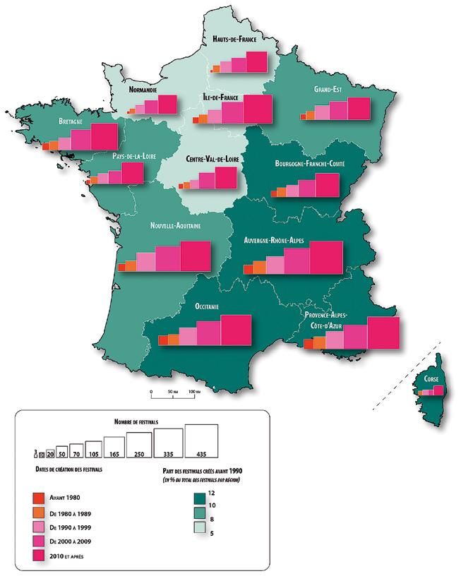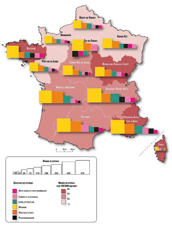 débutées en 2019, en 2021 et en 2022 (graphique) 134 Festivals Nombre de festivals en 2019 (carte) 140 Densité des festivals rapportée à la population régionale (carte) 141 Saisonnalité des festivals (carte) 142 Décennie de création des festivals (carte) 143 Discipline dominante (carte) 144 Pratiques culturelles Évolution des pratiques culturelles, 1973-2018 150 Supports d’écoute de musique regroupés par types selon l’âge en 2018 (graphique) 152 Genres musicaux pratiqués et écoutés en 2018 (graphique) 153 Pratiques culturelles dans les territoires ultramarins Les pratiques culturelles dans les DroM et en France métropolitaine 157 Diffusion des pratiques en amateur au sein de la population Caractéristiques des personnes pratiquant une activité en amateur en 2018 161 Langues et usages des langues en France Maîtrise du français et des autres langues en France 164 Langues utilisées dans les consommations culturelles 165 Archéologie Évolution du nombre de diagnostics, de fouilles réalisées et de rapports rendus par l’Inrap, 2012-2022 170 Actions de valorisation conduites par l’Inrap, 2014-2022 170 Nombre de sites archéologiques répertoriés sur la carte des sites de fouilles de l’Inrap en 2022 (carte) 171 Architecture Distribution des revenus nets annuels des architectes selon le diplôme en 2021 (graphique) 176 Caractéristiques de la profession d’architecte en 2020 177 Évolution des montants totaux de travaux par type de maître d’ouvrage, 2010-2020 (graphique) 177 Archives Accroissement annuel des fonds d’archives en 2021 181 Mise à disposition de fonds d’archives en ligne, 2018-2021 181 Action culturelle et scientifique des services d’archives, 2013-2021 181 Fonds occupés dans les archives départementales en 2021 (carte) 182