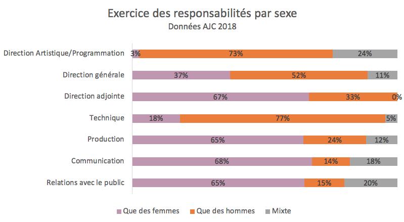 On observe une répartition identique des responsabilités dans les équipes des structures de diffusion du jazz29. La direction artistique et la programmation, ainsi que la direction générale, sont majoritairement assumées par des hommes (à 73% et à 52%), de même que la technique, qui reste une affaire d’hommes à 77%. La direction adjointe est à 67% féminine, de même que la production (à 65%), la communication (à 68%) et les relations avec les publics (à 65%).