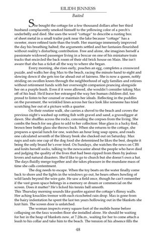 he bought the cottage for a few thousand dollars after her third husband complacently smoked himself to the yellowing color of a perch’s underbelly and died. She uses the word “cottage” to describe a rusting box of sheet metal in a small trailer park near the lake because “cottage” has a sweeter, more refined taste than the truth. Her marriage immensely improved the day his breathing halted; the arguments settled and her fantasies flourished without reality’s disturbing contribution. Free and alone, she imagines herself a passionate widowed passenger living in a boxcar on one of his miniature train tracks that encircled the back room of their old brick house on Main. She isn’t aware that she has a ticket all the way to where she began. Every morning, she rises early, poaches an egg, completes a crossword puzzle, and walks her dog Max to the beach, racing the minute hand to eight and slowing down if she gets too far ahead out of fairness. She is now a queen, nobly striding on swollen knees through the neighborhood of ugly families and retirees without retirement funds with her overweight companion prancing alongside her on a purple leash. Even if it were allowed, she wouldn’t consider taking Max off of his lead. He’d leave her estranged the way her human children did, too proud to listen to her counsel or maintain her ideals. Reflecting in the puddles on the pavement, the wrinkled lines across her face look like someone has tried scratching her out of a picture with a quarter. On their routine walk, she carries a shovel to the beach and covers the previous night’s washed up rotting fish with gravel and sand, a gravedigger at dawn. She shuffles across the rocks, concealing the corpses from the living. She combs the beach for sea glass to add to her collection: blue glass is a lucky find, brown beer bottle glass she throws back. When she returns to the cottage, she prepares a special lunch for one, watches an hour long soap opera, and reads one calculated seventh of the library book she checked out on Saturday. Max naps and eats one cup of the dog food she determined he likes the best, despite it being the only brand he’s ever tried. On Sundays, she watches the news on CBS and knits herself socks, talking to the newscaster about the people who have died and judging the quality of the lives that had been ripped from them by jealous lovers and natural disasters. She’d like to go to church but she doesn’t own a hat. The days fluidly merge together and she takes pleasure in the mundane mass of time she calls contentment. The dog needs to escape. When the toy boats on the water finally come back to shore and the lights in the windows go out, he hears others howling of wild lands beyond the wire gate. He saw a field once, though he can’t remember if the vast green space belongs in a memory or dream or commercial on the screen. Does it matter? He’s licked his tennis ball smooth. This Thursday morning sounds like gunfire against the cottage’s flimsy walls. Her aching knuckles tremor with each ricocheted rain drop. Max is gone from the hairy indentation he spent the last ten years hollowing out in the blankets she knit him. The screen door is unlatched. The woman inspects every square foot of the mobile home before collapsing on the faux wooden floor she installed alone. He should be waiting for her in the heap of blankets now, at 7:20a.m., waiting for her to come attach a leash to his collar and take him to the beach. The tension of his absence fills the