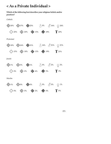 <"As"a"Private"Individual">" " Which"of"the"following"best"describes"your"religious"beliefs"and/or" practices?" $ Catholic) ) $ 0%$ 16%$ 24%$ 20%$ 17%$ 23%$ $ ) ) $20%$ 23%$ 20%$ 15%$ 18%$ ) ) Protestant) ) $ 21%$ 21%$ 14%$ 18%$ 16%$ 31%$ $ $ $ $ $ $ ) ) 15%$ 18%$ 13%$ 19%$ $21%$ ) ) Jewish) ) $ 2%$ 2%$ 0%$ 1%$ 3%$ 1%$ $ ) ) )2%$ 0%$ 0%$ 4%$ 5%$ ) ) Muslim) ) $ 0%$ 0%$ 1%$ 1%$ 0%$ 0%$ $ ) ) $0%$ 0%$ 0%$ 2%$ 0%$ )