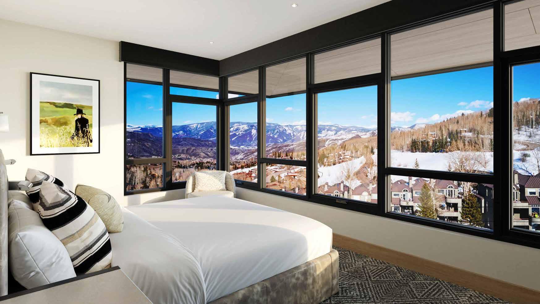 • Floor-to-ceiling windows facing Assay Hill ski trail, and an extended balcony accessible from both the great room area and primary bedroom.