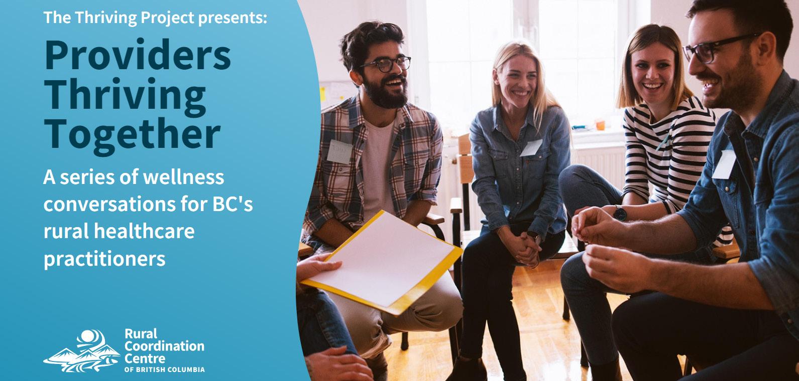 Providers Thriving Together Wellness Conversations Series, part of RCCbc’s Thriving Project, led by Dr. Tandi Wilkinson. These free monthly virtual dropin sessions offer a facilitated space for rural healthcare practitioners to connect and discuss wellness-related topics in the service of activating their collective resilience.