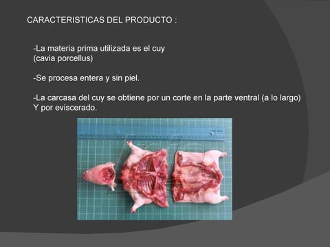 CARACTERISTICAS DEL PRODUCTO : -La materia prima utilizada es el cuy (cavia porcellus) -Se procesa entera y sin piel. -La carcasa del cuy se obtiene por un corte en la parte ventral (a lo largo) Y por eviscerado.