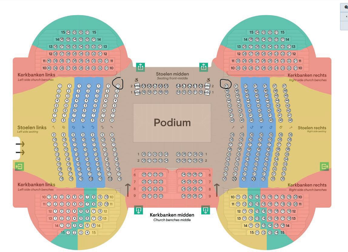 Rij 1 is beschikbaar wanneer de uitbouw van het podium niet in gebruik is. Kijk hiervoor op onze website. Zitplaatsen op 2e balkon en 2e orkestring zijn uitsluitend via trappen te bereiken.