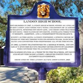 The Landon Alumni Association, led by graduates Charlie Rooks, William Harrell, Howard Coker and Bill Warner, have begun discussion with the City of Jacksonville to place a historical marker commemorating the history of the former high school.