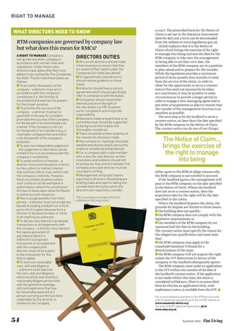 RTM companies are governed by company law but what does this mean for RMCs? A Right to MAnAge Company is set up, like any other company in accordance with certain rules and regulations. Under these rules, directors have duties that they must adhere to as outlined by The Companies Act 2006. The Act lists these duties as follows: n To act within the powers of the company – a director must act in accordance with the company’s constitution (i.e. the Articles of Association) and exercise his powers for the proper purpose. n To promote the success of the company – a director must act in good faith in the way he considers promotes the success of the company for the benefit of its shareholders as a whole. If the company is not run for the benefit of its members (e.g. a charitable company) then promotion is for the benefit of the company’s purposes. n To exercise independent judgement - this judgement or discretion can be limited if this is in accordance with the company’s constitution. n To avoid conflicts of interest – a director must avoid situations in which he has a direct or indirect interest that conflicts with or may conflict with the company’s interests. However, there are limited situations where such conflicts can be exempted or authorised or where the constitution/ Articles of Association allow the Board to authorise such situations. n Not to accept benefits from third parties – a director must not accept any benefit (including a bribe) from a third party which is given because he is a director or because he does or omits to do anything as a director. n To declare any interest in proposed transactions or arrangements with the company – a director must declare the nature and extent of any interest (direct or indirect) in a proposed transaction or arrangement with the company (the director need not be a party to the transaction for this duty to apply). n To exercise reasonable care, skill and diligence – a director must exercise the care, skill and diligence which would be exercised by a reasonably diligent person both with the general knowledge, skill and experience that may be reasonably expected of a person carrying out the functions undertaken by the director in relation to the company.