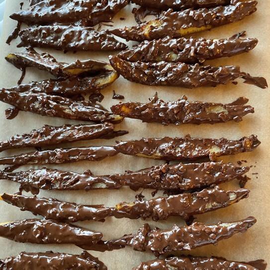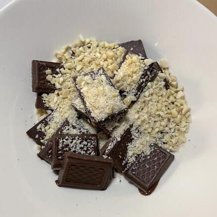 Kuori ylikypsä reilusti tummunut banaani ja laita pakkaseen yöksi jäätymään. Raasta pieneen kulhoon jäätynyttä banaaniraastetta, valuta päälle hieman makeuttamatonta kookosmaitoa ja raasta tummaa suklaata tai maitosuklaata päälle. Koristele annos karamellisoiduilla manteleilla, jotka tuovat mukavaa purutuntumaa tai nauti sellaisenaan!