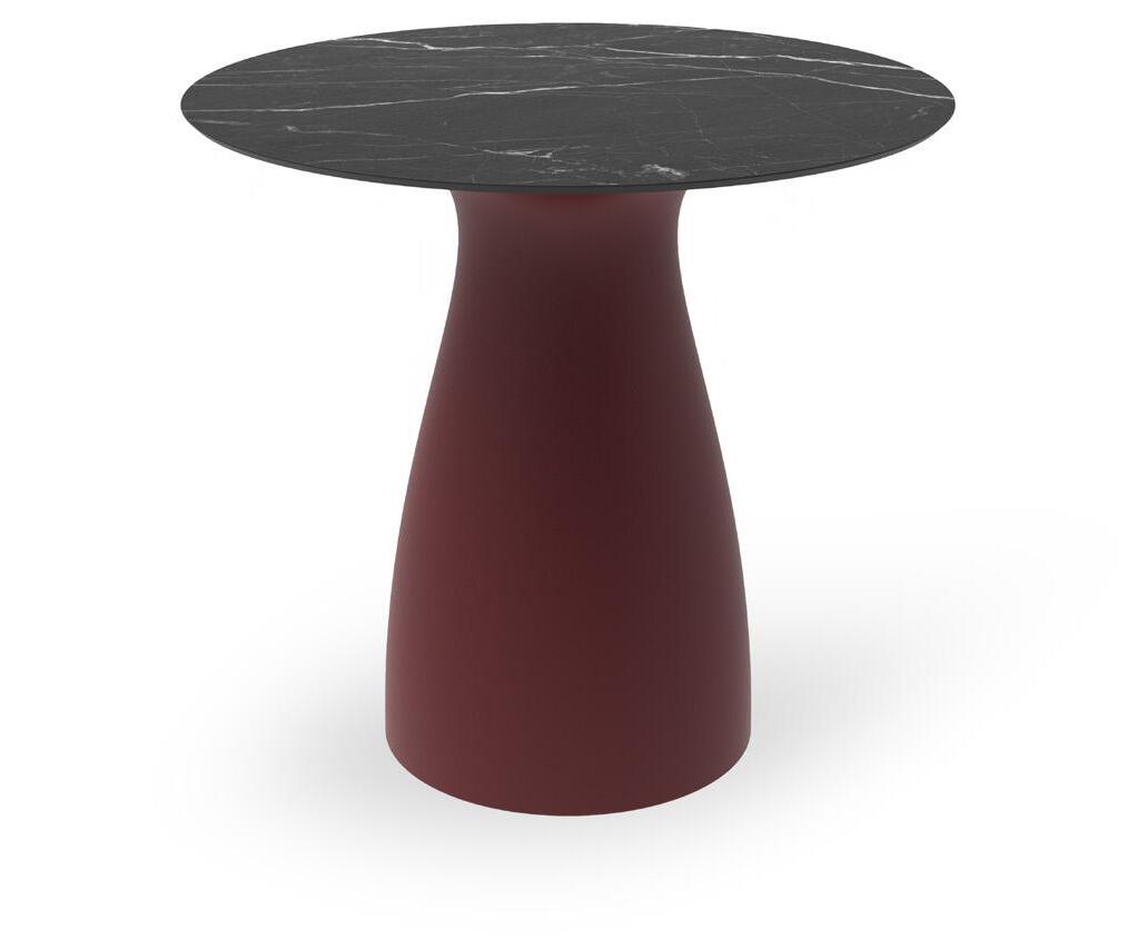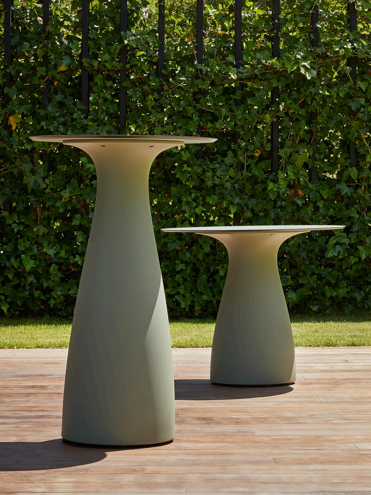 El sistema de mesas se basa en una estructura de pie de polietileno fabricada con la técnica del rotomoldeo y sobre este pie reposa el sobre de la mesa de formas redondeadas y perfil viselado.
