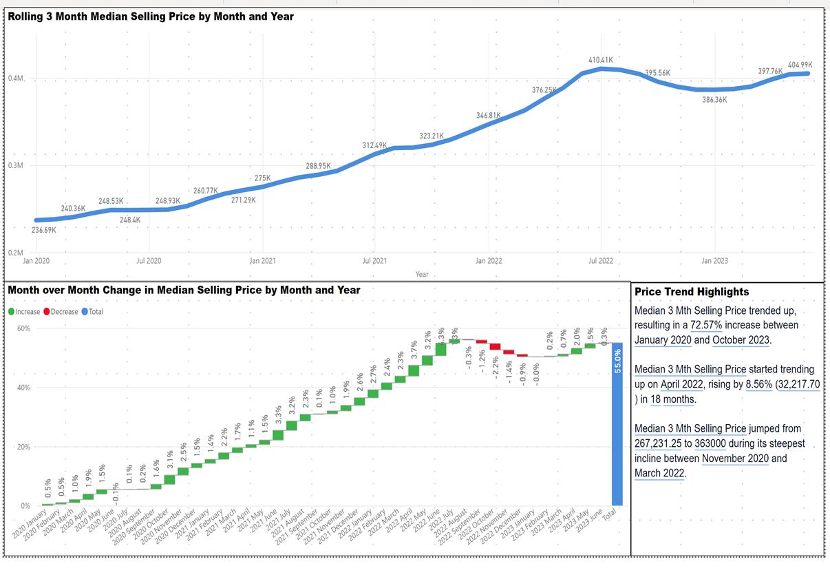 1. Rolling 3 Month Median Selling Price by Month and Year – The blue line shows the median 3 month rolling price for each month since January 2020. This date is the starting point of the market change since the start of the pandemic.