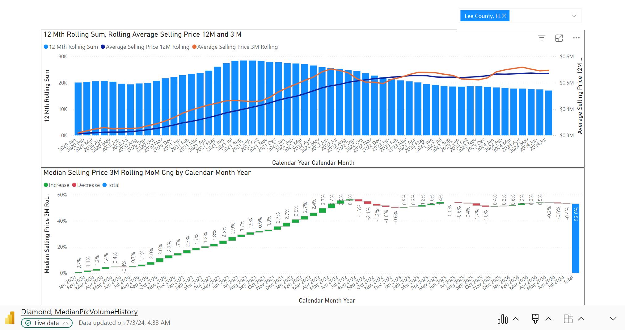 2. Month over Month Change in Median Selling Price by Month and Year – This waterfall chart shows the monthly change in the 3 month median sales price. Each month is color coded Green if the change is positive and Red if the change is negative. The solid blue bar on the right of the chart shows the total percentage change in median pricing from January 2020 to the current month. Understanding the trend in monthly change in median pricing provides insights into the long term direction of pricing and can help explain and measure how price changes are impacted by economic or weather events. In this case, the downward trend reflected the impact of Hurricane Ian on the residential real estate market.