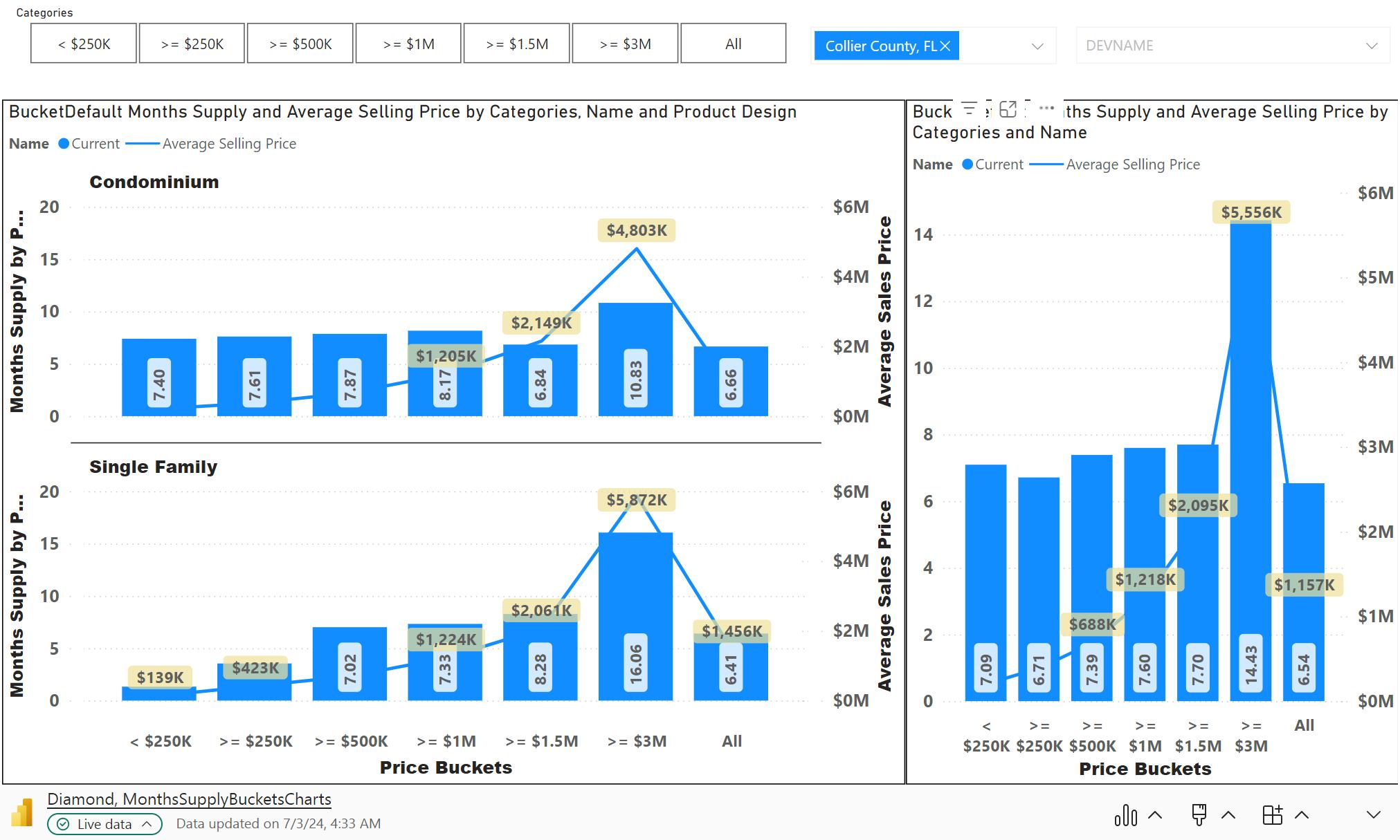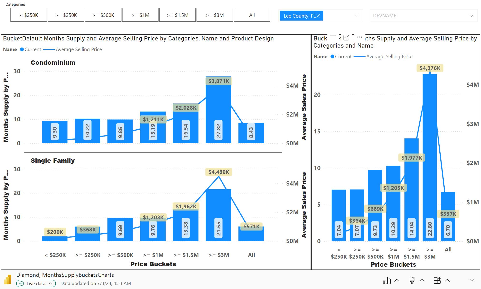 This set of graphs show the months supply by price bucket or range. The ranges are; Less than $249K, $250K to $499K, $500K to $999K, $1M to $1.49M, $1.5M to $2.9M and Greater than $3M. The lines show the Median and Average Price of sales within each price range. This information provides insights into the supply demand ratio for each price range.